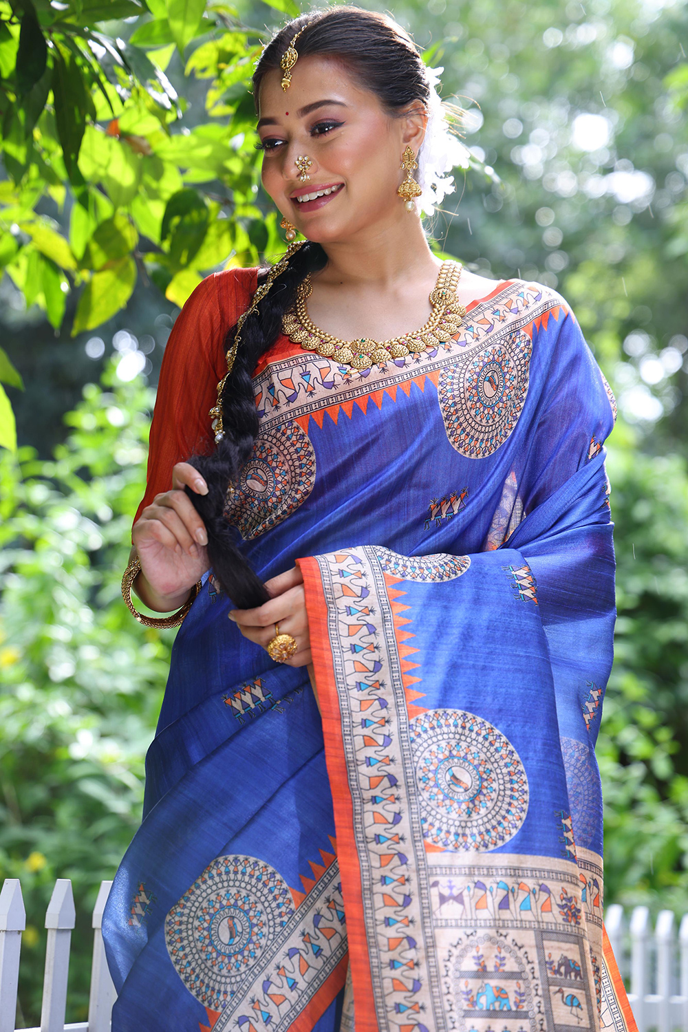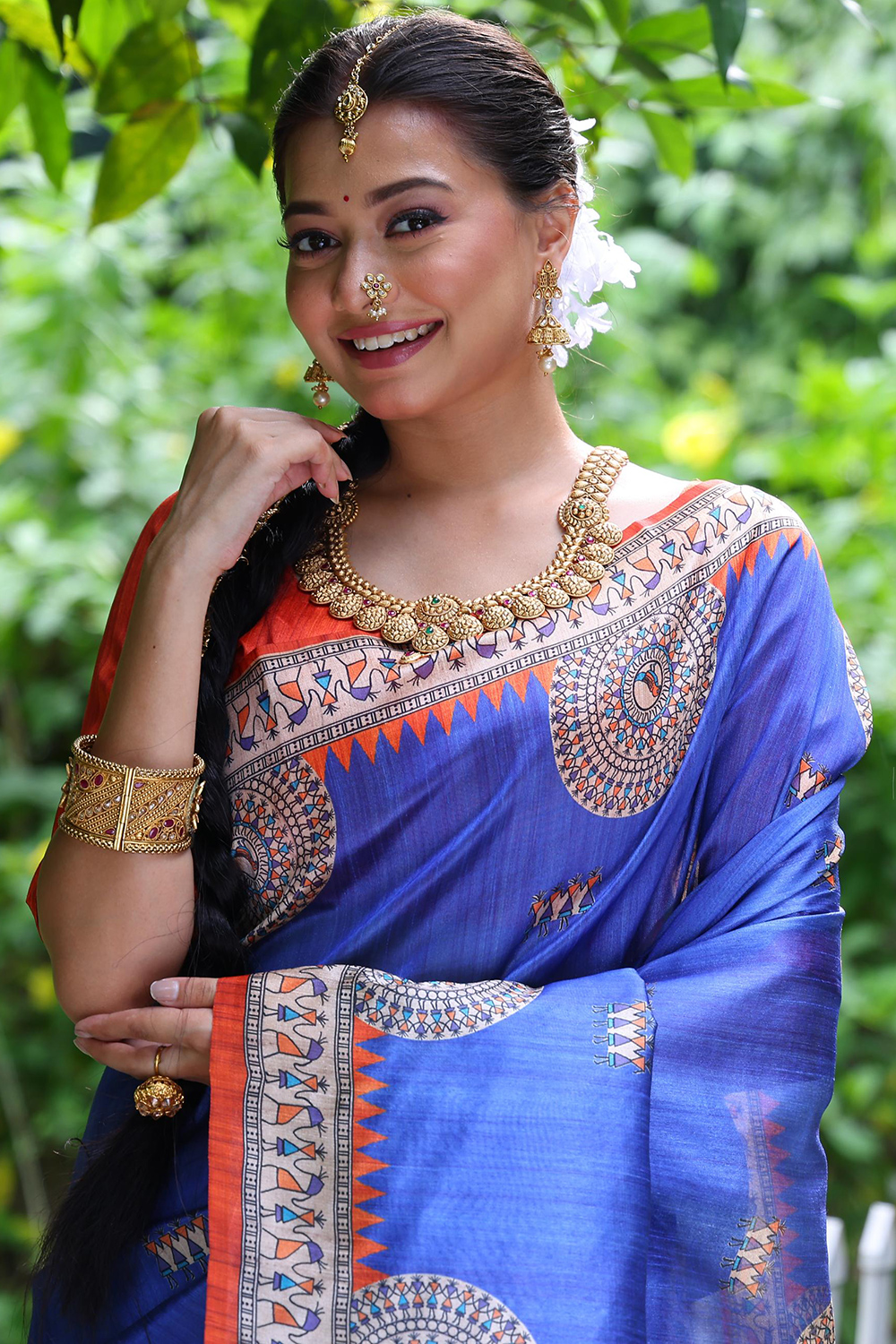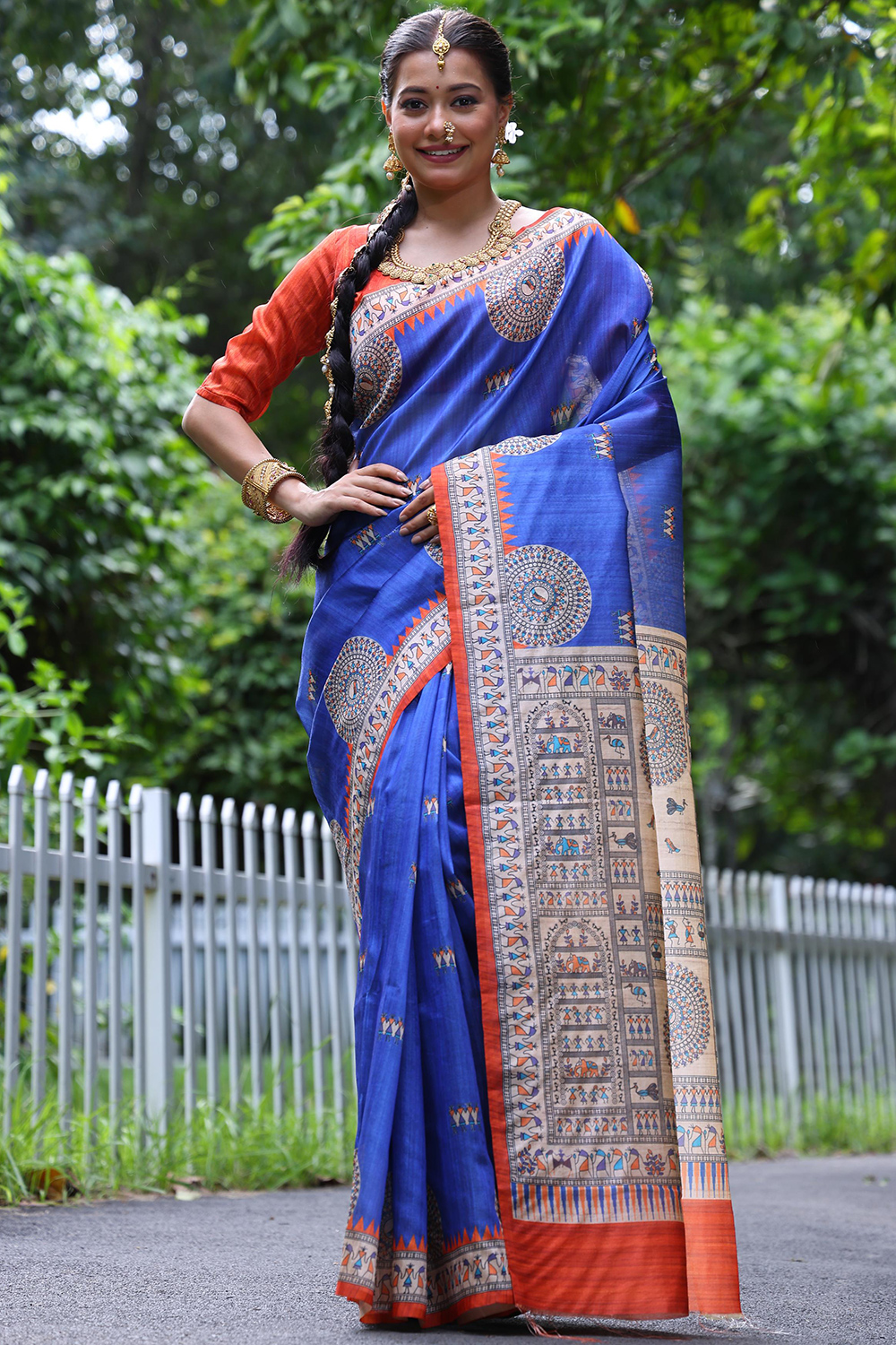 It is available with tussar silk light weight saree in royal blue color perfectly formed using warli print work.
