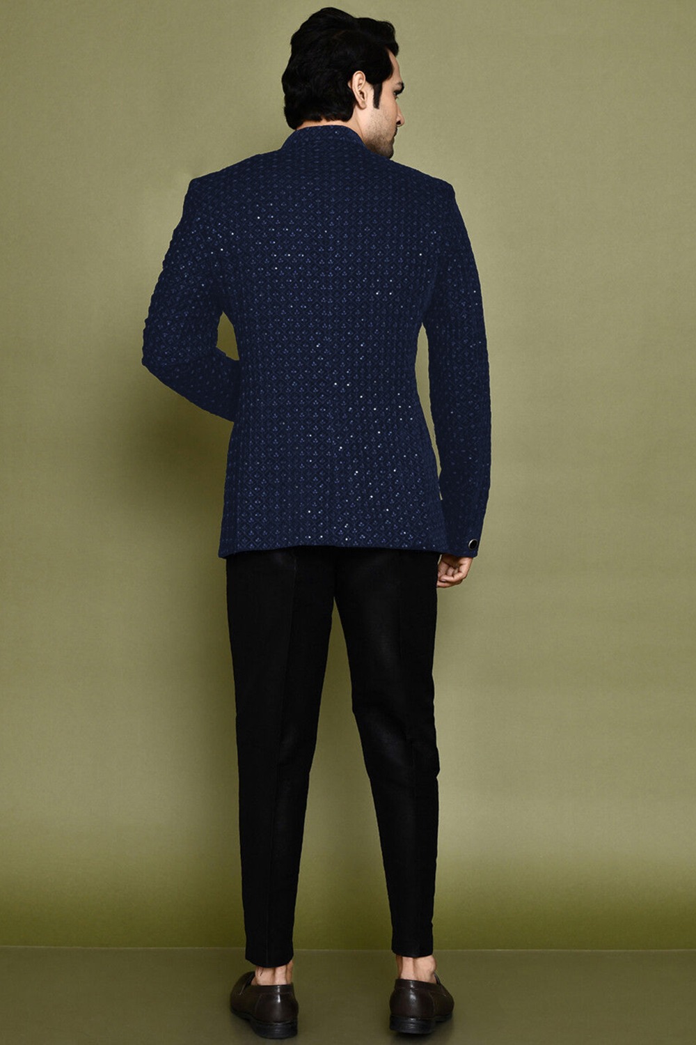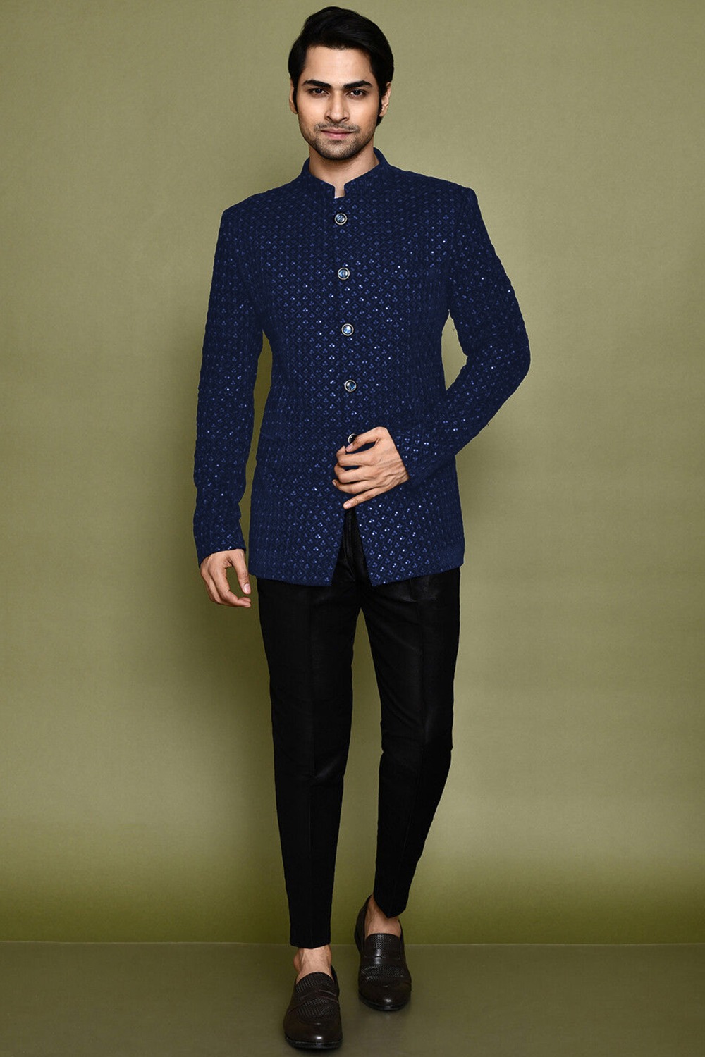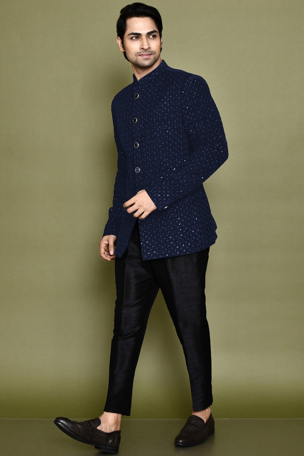Viscose Navy Blue Embroidered Jodhpuri Style Men's Sherwani