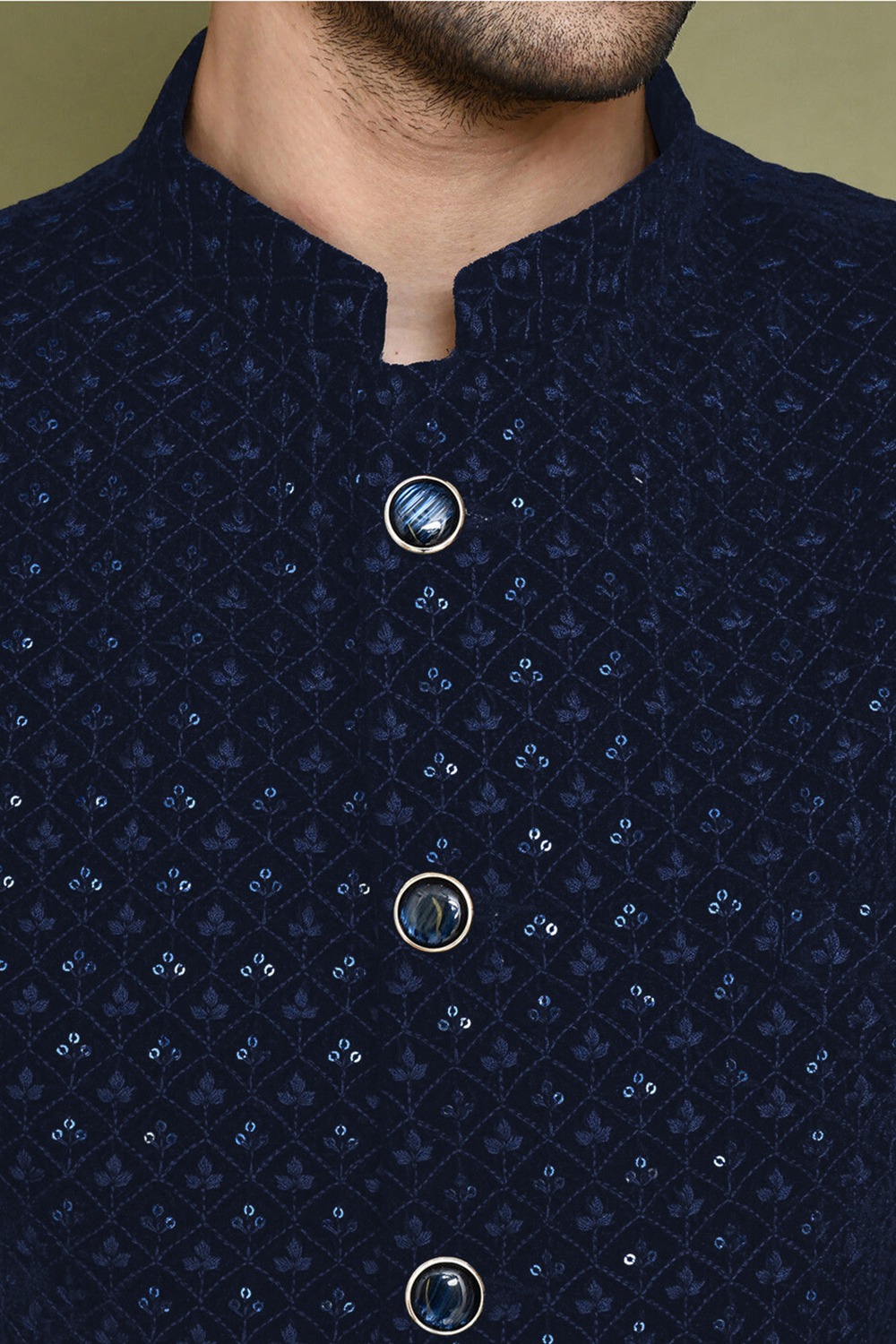 Elevate your style for any festive gathering with this striking navy blue jodhpuri-style men's sherwani ensemble. It is made from viscose fabric and boasts intricate resham thread and sequins work, enhancing its timeless charm. The Chinese collar and full sleeves offer a stylish touch, while the bottom made of art silk fabric completes the look. This sherwani can be customized up to a maximum size of 68 inches.