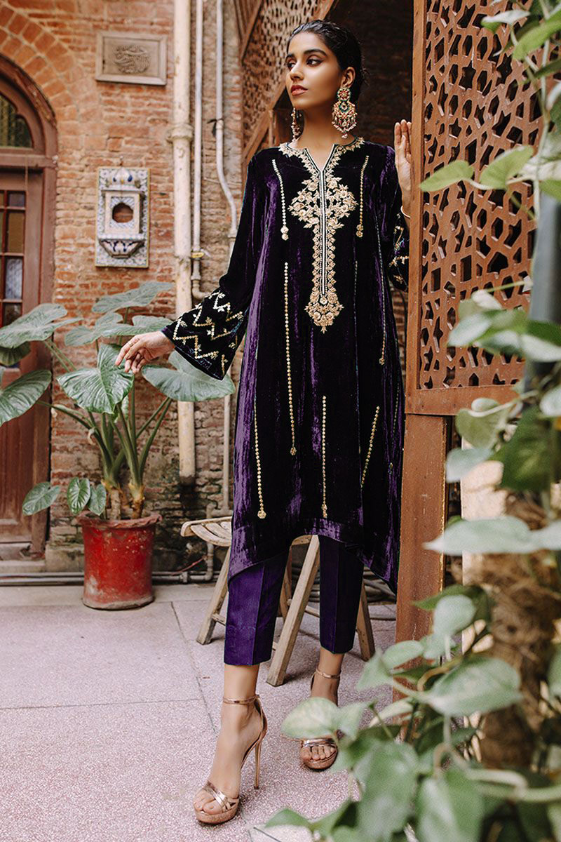 Exhibiting elegant embroidery and stitch detailing, this violet velvet trouser suit will provide you with unmatched all day comfort.