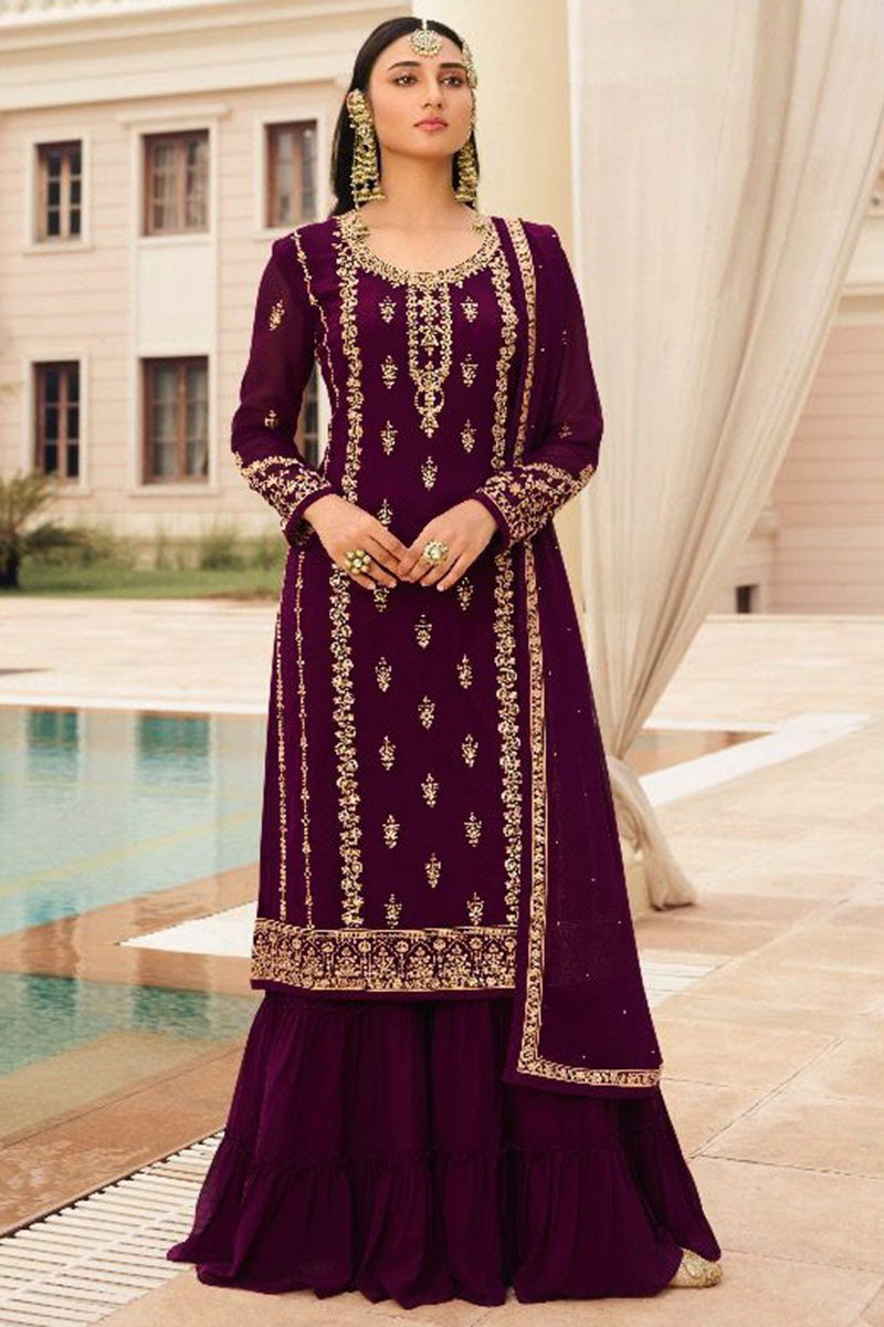 Be the cynosure of all eyes by wearing this wine georgette sharara suit which will certainly make you rule to the party.