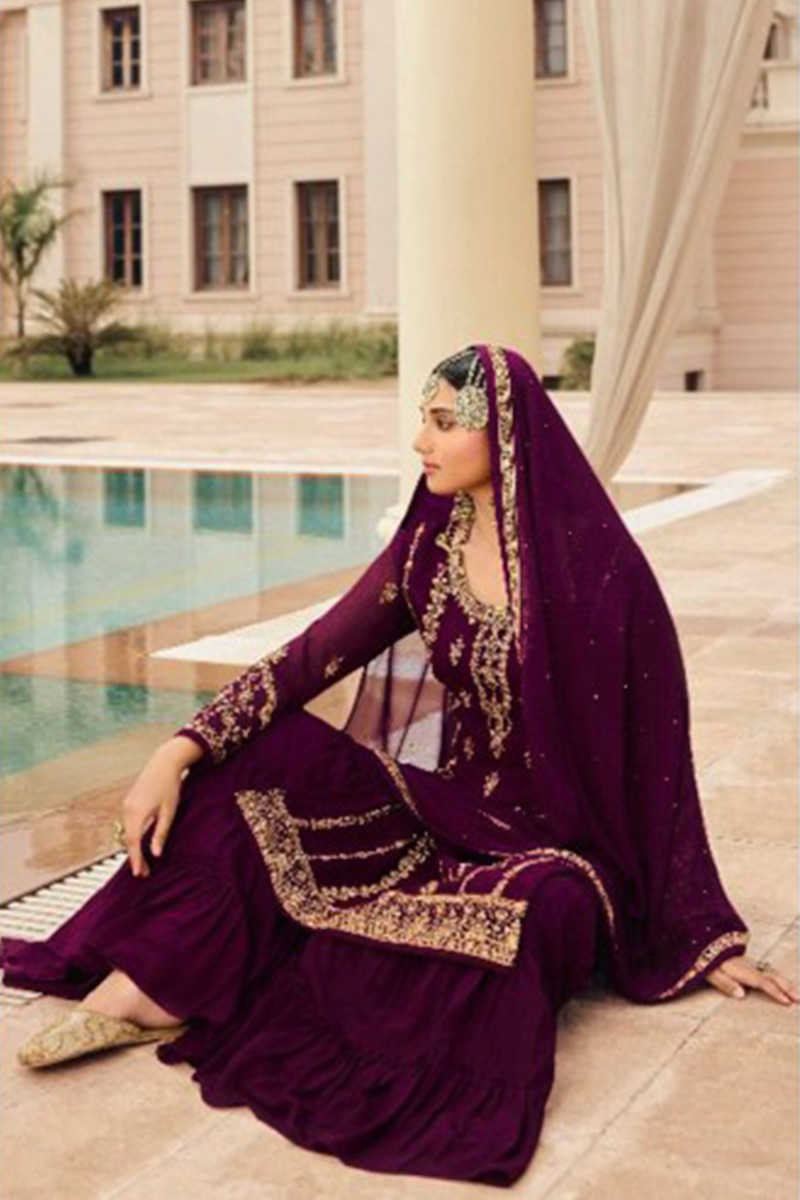 Accompanied by a matching georgette sharara pants in wine color with wine georgette dupatta.