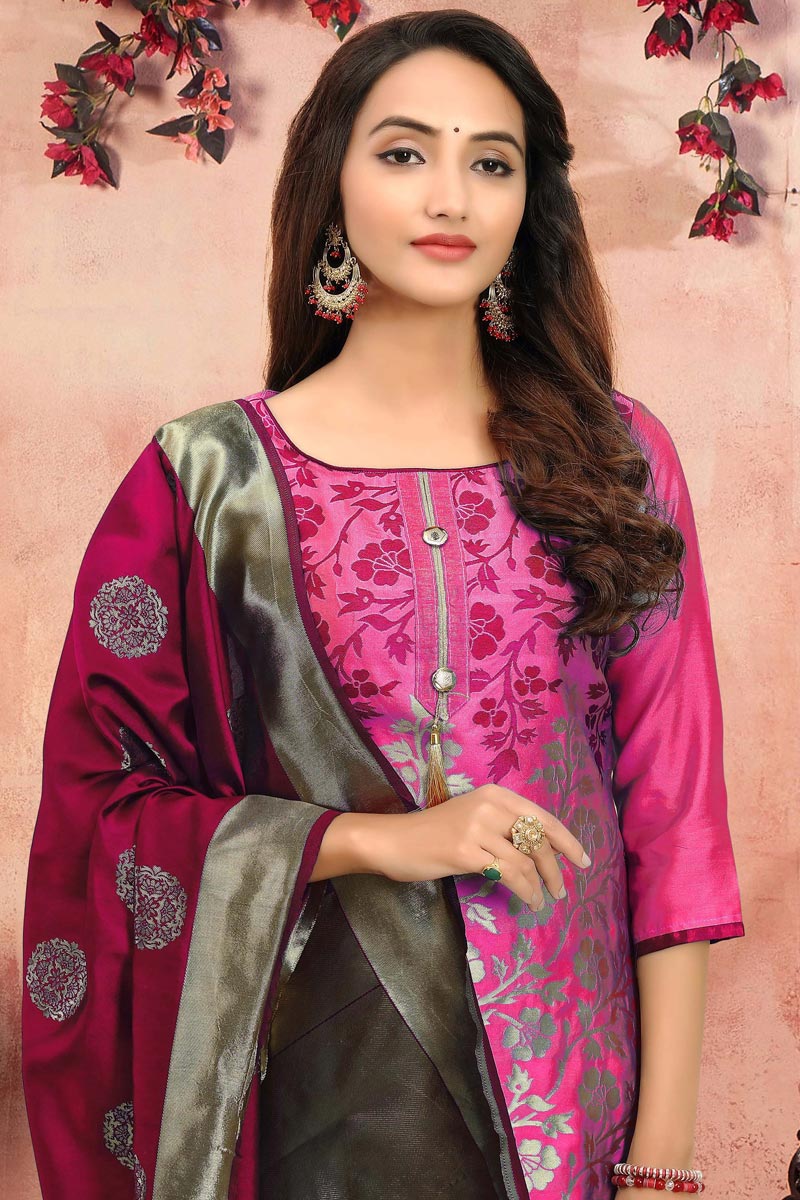 Exhibiting an elegant embroidery and stitch detailing, this pink jacquard churidar suit which will make you ready to make a statement in the upcoming occassion.